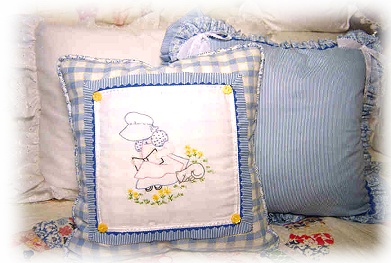 Whimsical Pillow #W305 Size 14 x 14 Polyfill form Teddy bear "Peter" is printed on cotton fabric with vintage accent buttons and rope fringe. price $45.00