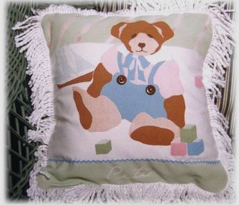 Teddy bear "Peter" is printed on cotton fabric with vintage accent buttons and rope fringe.