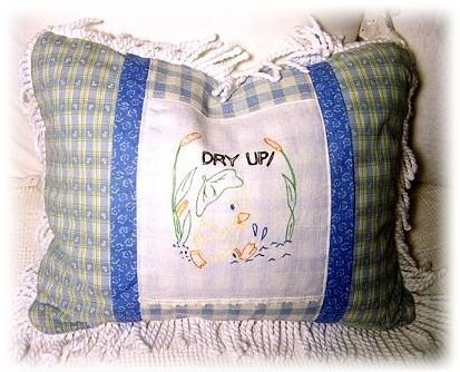 Whimsical Pillow #W307 Size 16x 20 Down filled form Vintage tea towel with a cute duck is splashing across the pillow made of coordinating cotton fabric and white cotton. Terry cloth backing with rope fringe price $95.00